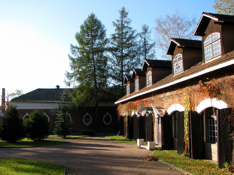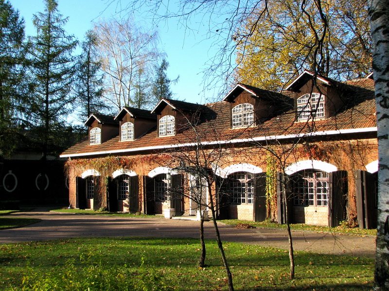 Рядом имеются 2 кирпичные постройки - 19 века каретный сарай и конюшня 1910 года. Что радует, они в прекрасном состоянии. Там даже снимают сейчас какое-то кино. Тут же есть замечательной архитектуры водонапорная башня и какие-то ещё одноэтажные обвалившиеся сараи, вроде бы досоветского возраста.