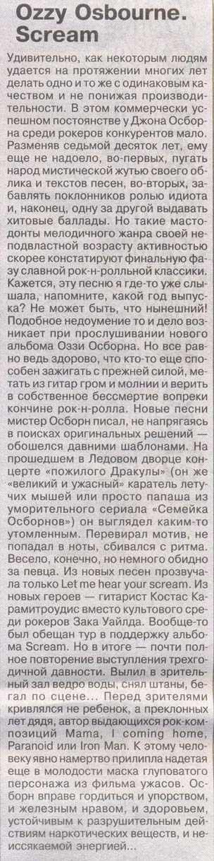 Последние два альбома я не слышал. Ozzy хороший вокалист и хороший композитор. Но его живые выступления разочаровали меня ещё 1989-м, когда он приезжал в Москву на фестиваль Стаса Намина. Просто стыдно было смотреть - те же самые непопадания в ноты, сгорбленное шарканье по сцене..