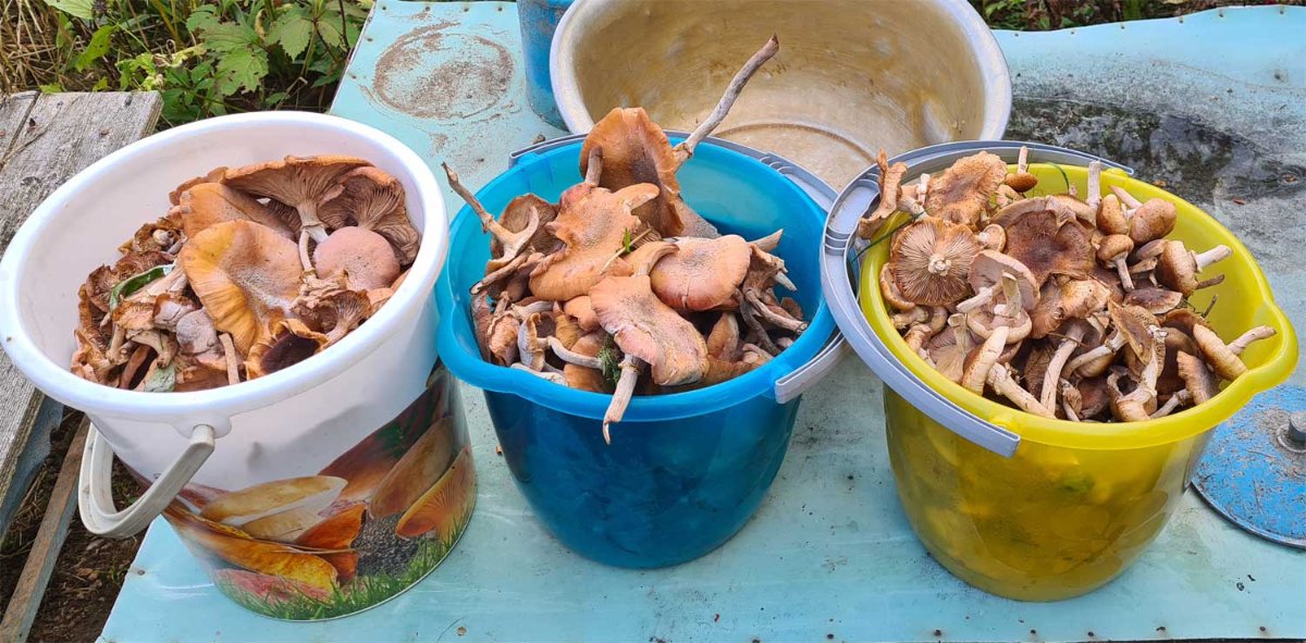 Дедушка [уже] старый, ему лениво ходить в лес. Да и зачем, если в огороде выросли свежайшие опята