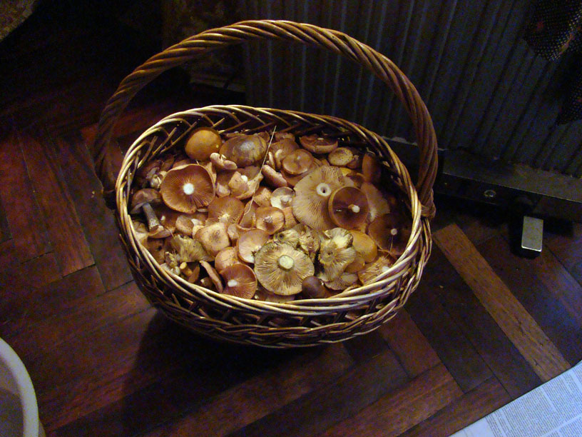 Благородные грибы в бору все-таки заканчиваются. Взято 4 белых (боровики), чуть больше десятка красных, единичные подбери и маслята. Неожиданно порадовали моховики, продолжают вылезать краем болот. Местами обильно растут горькухи, при желании можно набрать. Ну и конечно, слой опят. Обнаружил несколько сухих сосен с опавшей корой, а внизу, вокруг ствола - массовые семейства опят, "карабкающихся" вверх, по стволу. Не удержался, порубал одно семейство, и заполнил треть корзины. Душистые грибы, однако. Так что домой приволок опять полную корзину. Представляю, сколько ентих самых опят можно сейчас взять в смешанном лесу!