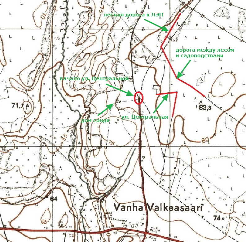 На финской предвоенной карте на Озерном шоссе имеется место, которое можно назвать "пять углов", ибо в нем сходятся пять дорог различного качества или значения (на рисунке - в кружке). Здесь направо теперь отходит улица Центральная СНТ "Железнодорожник". Прямо как и сейчас шла дорога на Камешки/Калелово, направо по диагонали уходила дорога на озеро, налево была тропиночка к дому сонди (пономаря валкеасарской кирхи), справа снизу примыкала дорожка местного значения со стороны шоссе.