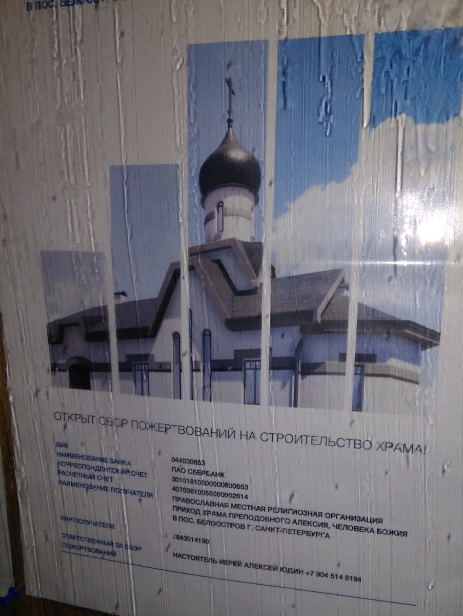 Братья и сестры! Принято решение о строительстве Храма Алексия Человека Божьего в Белоострове. Выделена земля, имеется проект. Литургии временно (до постройки Храма) проходят каждое воскресение в 10-00, в том же здании, где располагается белоостровская почта (в комнате напротив) по адресу Сестрорецкое шоссе, д. 4. Добро пожаловаться!