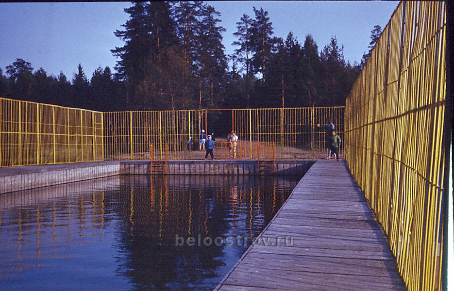 Купальня состояла из двух прямоугольных чаш-мелкая(лягушатник) и основная(больше и глубже). Когда она стала разрушаться ,на ,пятаке, поставили новую на понтоннах ( та ,что на фотках выше). Очень народ любил играть на ней в пятнашки