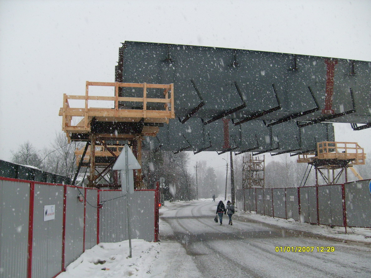 1 марта во второй половине дня над Александровским шоссе перекинули две сдвоенные фермы ЗСД, изготовленные на Борисовском ЗММК. Последние установили на технологические опоры. В последующем их удлинят с двух сторон с крайними фермами, которые будут опираться на основные ж/б вертикальные стойки в виде грибов. Общая длина висячей фермы между ж/б стойками составит около 30м.