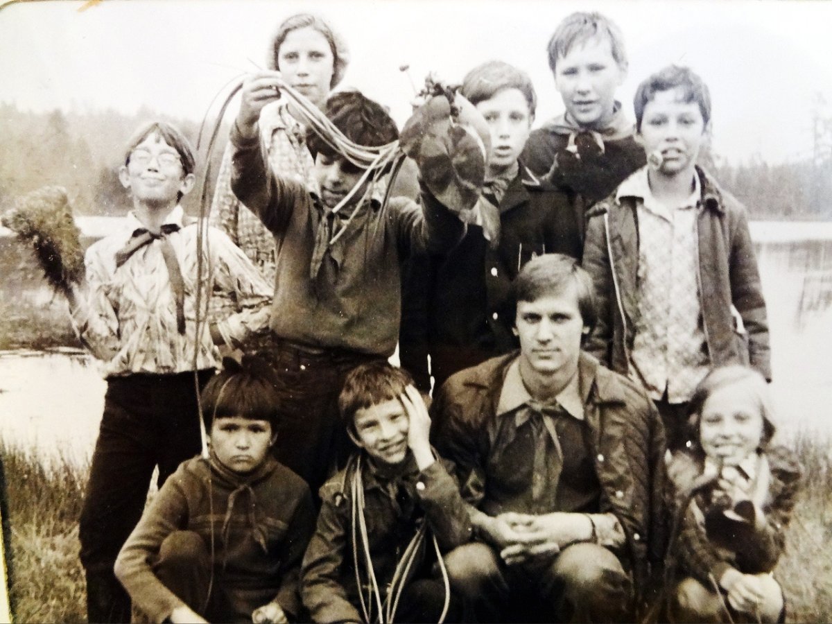 Лето 1973 года. Пионерский лагерь "Чайка", Главленинградстроя, трест №105. После купания оз. Пасторское , 1 творческий отряд. Это пионеры с вожатыми. Возраст 13-15 лет. (нашел на одном из сайтов)