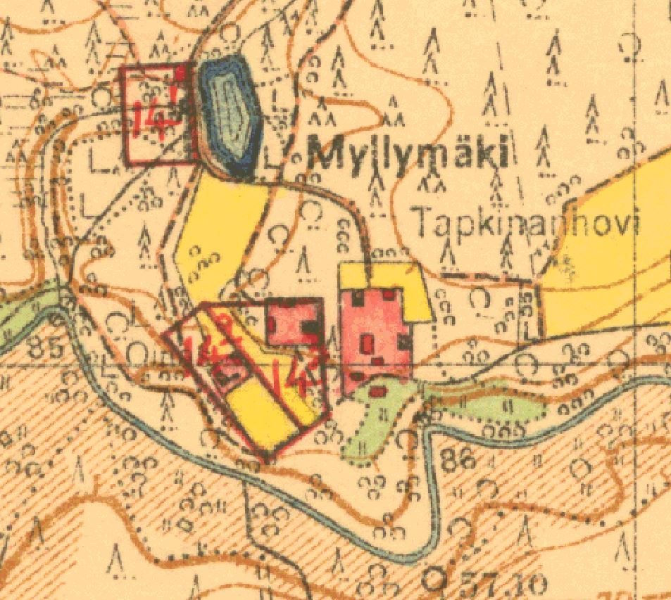 Мельница (14-1) и погреб (14-2) с 1904 года принадлежит семейству Ойнас (условное допущение, потому что мельница называется Oinaan). При этом надо заметить, что в строке, где должен быть указан собственник, стоят инициалы - у мельницы H.S., а у погреба - Y.O. Участок пограничников (14-3) принадлежит им с 1926 года.