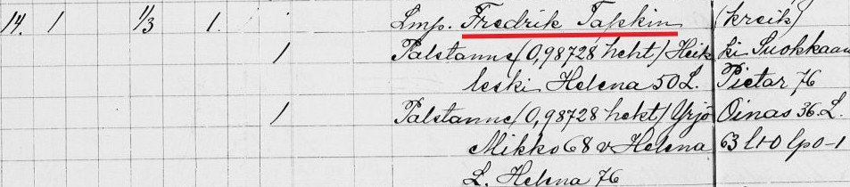 Есть одно газетное объявление от 1912 года, где упоминается 14 участок в Ахиярви. И там присутствует Феодор Тапкен. Фредрик, тем более православный, может быть Федором, а изначально - Фридрихом, например. Поэтому искать и сложно.