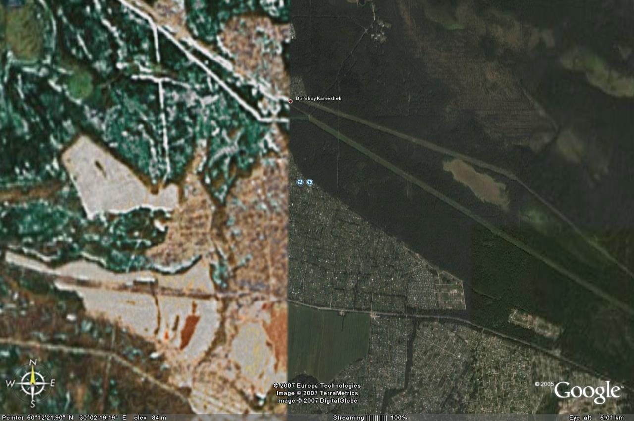Насчёт аэрофотосьёмки, Aqua$erg вы наверно не правы. Если-бы это снималось с самолёта, то не был-бы такой ровный квадрат высокого разрешения. Например старые советские спутники фотографировали местность шириной ~150 километров с разрешением 10 метров. А сейчас разрешения больше. Американцы просто сфотографировали Сертолово, Чёрную речку с высоким качеством, а остальное им не надо было. И у меня чувство, что снимок, который слева от качественного сделан в зимнее время, или около этого, потому что Люблинское озеро выглядит достаточно светло, наверно из-за снега.