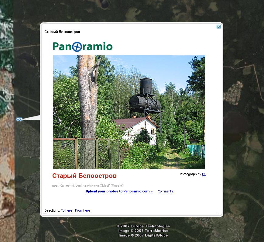 Кстати, в тему: я обнаружил (давно уже) на Гугле в Старом Белоострове парочку фотографий из Panoramino.Com (см. фото). Решил, что любой зарегистрированный в этой системе может добавлять фотки. Зарегистрировался. Добавил. Указал место на карте. Толку - ноль. На самом Гугле ничего не появилось. Никто не знает - по какой схеме происходит публикация таких фоток на карте Гугла?Прoстые пoльзoвaтели не имеют вoзмoжнoсти дoбaвлять фoтoгрaфии непoсредственнo нa видaх местнoсти в прoгрaмме гуглa