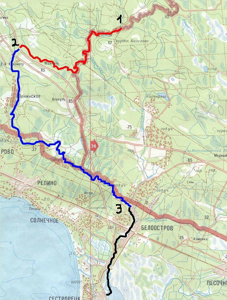 3 года назад мы с товарищем сплавлялись по нижнему течению Сестры (черный цвет - см карту). Но про подобные сплавы по тому маршруту мне приходилось слышать от других людей. Так что это не очень интересно.