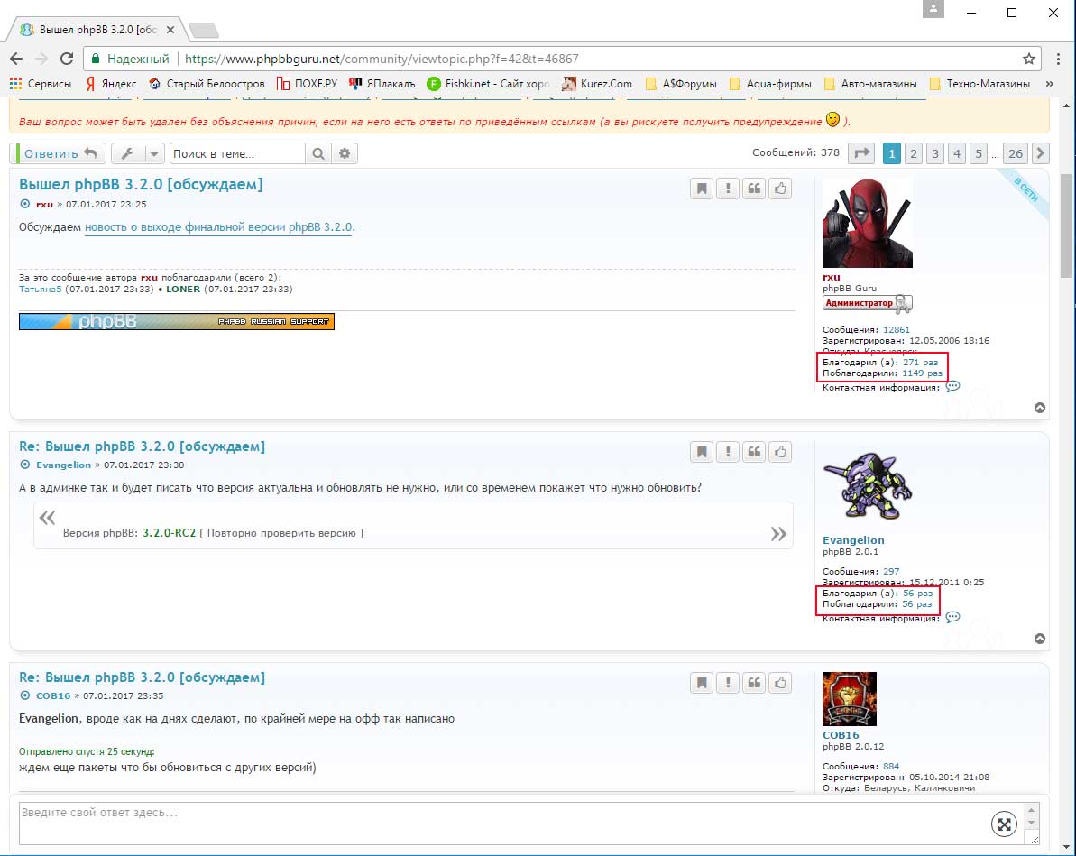 2. Подглядел, что есть у русских разработчиков нашего движка: тоже есть "благодарности", но без понижения репутации - только "спасибки" считаются. В официальных расширениях ничего подобного не нашел. Поищу у разработчиков. Но, раз на офф.сайте (phpbb.com) пока нет, может работать криво. Хотя, у себя (phpbbguru.net) они это реализовали