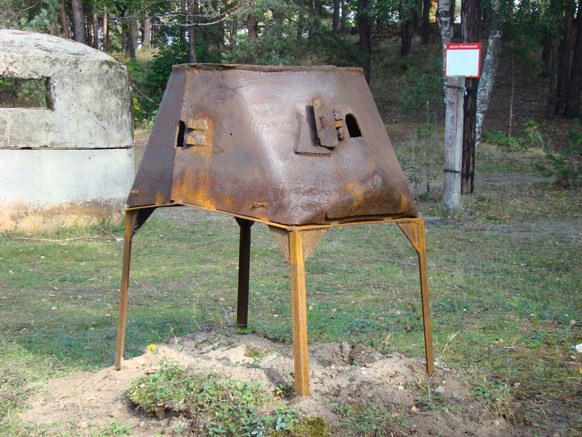 Полевая коллекция у ДОТа пополнилась. Привезена и установлена огневая точка на базе танка Т-28 с Меднозаводского БРО. Над аварийным выходом вместо утраченной бронебашни теперь красуется т.н. "Ижорская башня" под пулемет "Максим". Недалеко от ЖБОТов поставили еще одну стремную башенку - наблюдательный пункт, сваренный из пехотных бронещитков.