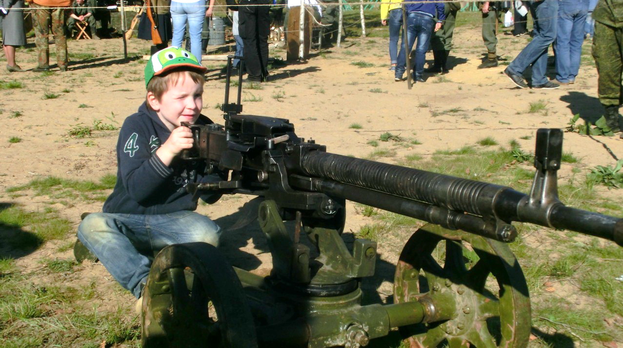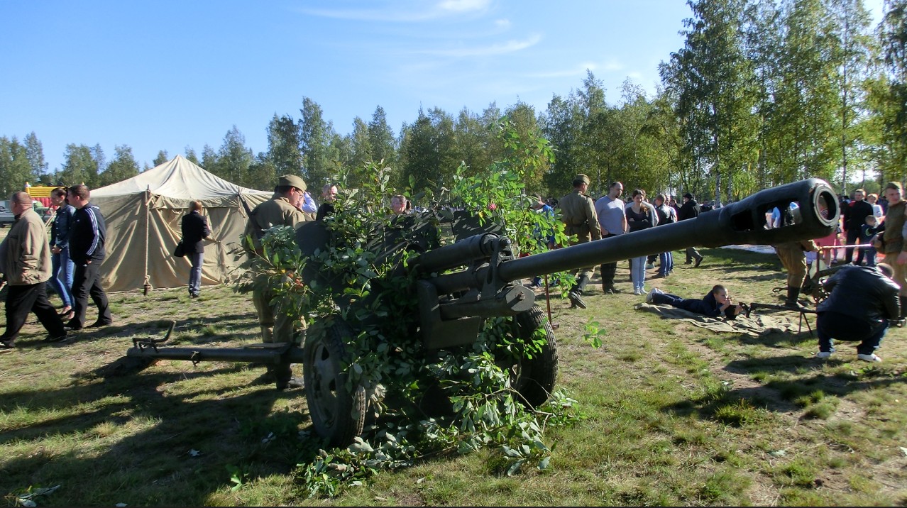 Начало действа было назначено на 13 нуль-нуль, и, казалось бы, чего с 10 до 13 делать? А делать было чего. Не знаю, что было в прошлом году ( в позапрошлом, как известно, Обама испугался выстрелов и праздник отменили), но сейчас уже были развернуты палатки с сувенирами в стиле милитари, кафешки, для детей готовились надувные горки и электромобили. Разбиты два лагеря РККА и вермахта. Немцы у палатки варили щи. Наши были в двух палатках. Одна связистская, а в другой разведка жила. Везде предметы военного быта. Завезена техника ( танчики, пушечки, автомобильчики, оружие). Танки времен войны, полуторки, грузовой опель, что-то типа авто Штирлица. На столах лежало оружие времен войны (ппш, ппс, винтовки разные, пулеметы максима, дшк, горюнова и т.д.) И современное из калашного ряда. Из всего можно было подолбить холостыми. Один патрон 50р. Чем больше берешь, тем больше скидка. Из пушек можно было пострелять всего за 300р. Из максимов, противотанковых ружей и т.д.
