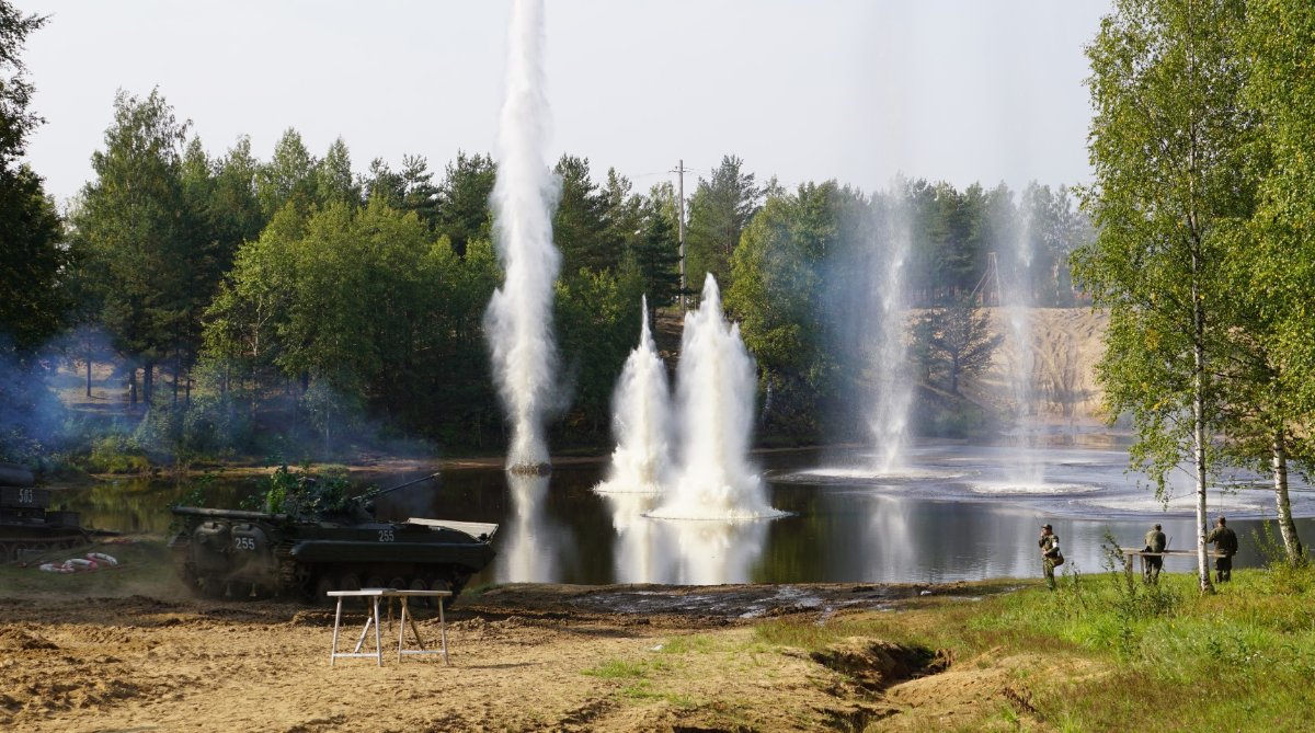 Действо началось с опозданием на 45 минут. Наверное опять генерал какой-нибудь на вертолете в пробку попал. Реконструкция Курской битвы, моджахеды, показательные выступления разведроты и ветеранов морпеха. Потом вождение под водой со взрывами и стрельбой. Три танка, три каких-то плавбтра и птс-4 с десантом. Домой поехали в 4 чaca