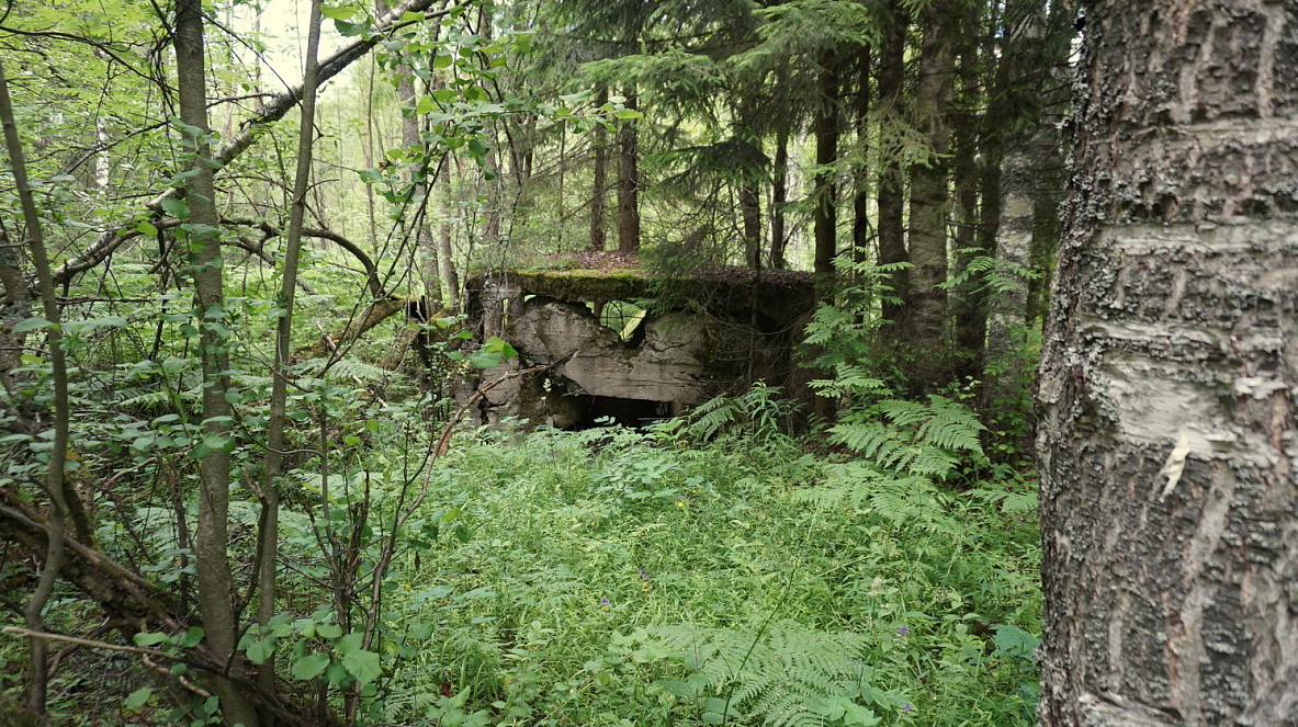 Следующий дот ну ооочень интересный. С многочисленными повреждениями. Бетон слабый, крошится. Арматурная металлическая решетка торчит из всех щелей. Постройка начала войны. Амбразуры фланкируют северное направление. Но и на них много повреждений. Финны могли по ним стрелять только из района каких-нибудь Рюне-мяки. А это километра 4. Снайпера что-ли? Есть еще одна фронтальная амбразура, которая сейчас имеет жалкий вид