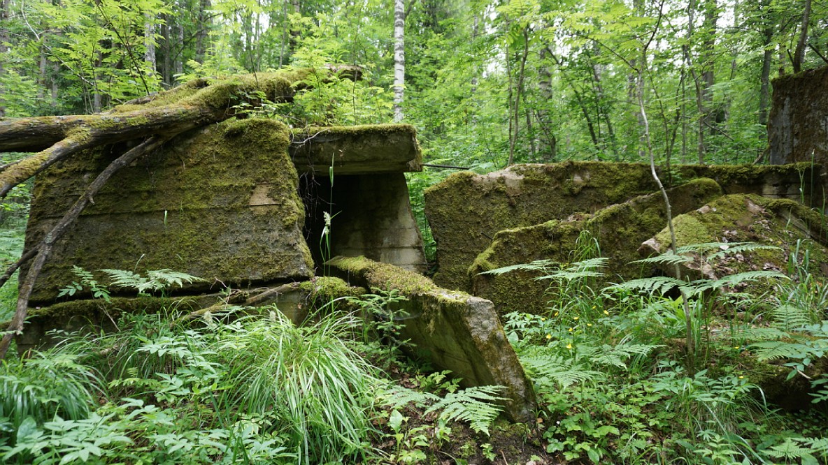 . От викингов и татаро-монголов обороняться, что ли? К двери дота ведет бетонированный (даже не знаю, как обозвать) подход метров 7-8. Он зачем-то взорван. Плиты валяются в беспорядке и немного загромождают вход в дот. На уровне земли еще есть то ли амбразуры, то ли проломы в стене