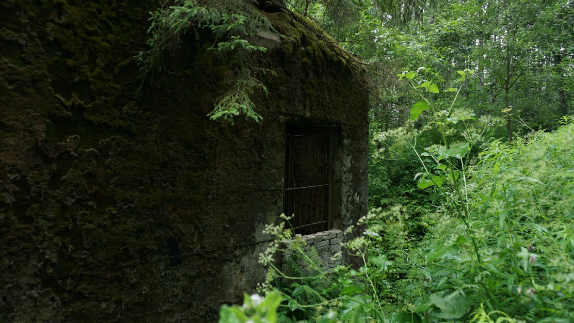 Еще дот один. Внешний вид похож на предыдущий. Все в дырках, бетон сколот, арматура торчит. Интересен тем, что к фланкирующей юго-западное направление пушке, добавлена фронтальная пулеметная амбразура. Зарос по самые помидоры. Не виден даже с пяти метров