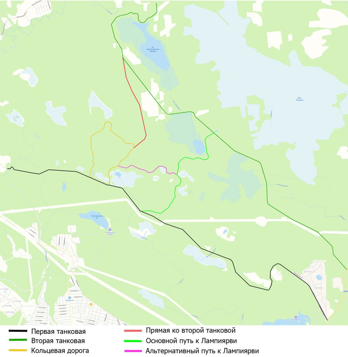 Нет, Хон слегка не так понял Вас. Первая танковая - дорога от Калеловской карьерной трассы до "Хонки" за Медным озером. За Пасторским - это после нефтепровода вверх, потом вниз и - перекресток. Влево-вправо и будет Первая танковая. Если проехать по ней вправо (ну или по нефтепроводу вправо, и потом выехать на Первую танковую), то после спуска и моста через Черную речку сразу же поворот влево - это тоже к Лампе. - этим путем я часто езжу. Есть пара неплохих грибных мест и болотца с клюквой