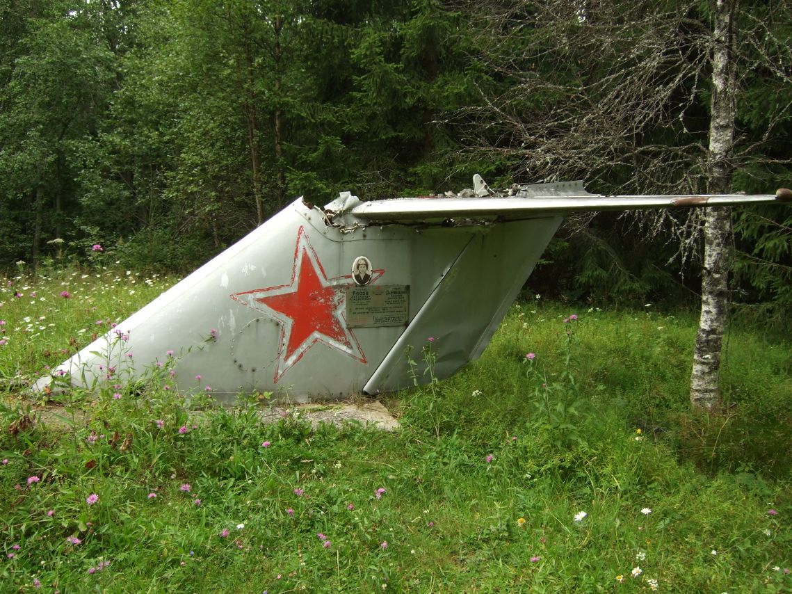 Проехали Сестру, началось садоводство Светлая гора, расположенное на месте бывшей финской деревни. И дальше в полях то тут, то там виднелись домики, вероятно, самозахват. Свет не подведен, воды нет. Как там живут? Километра через 3 от моста, забирая от развилок правее, уперлись в лес. Тут полный аллес капут. До того дорога была проезжей для абсолютно любого авто. Теперь даже военный Урал не справился бы. Разбито в хлам, лужи метров по 40-50. Даже на велосипеде плохо. Первые метров 600-700 пришлось бы нести на себе, продираясь по кустам. Далее колея в виде глубокой синусоиды с амплитудой сантиметров в 60-70. Около полутора км такого безобразия. Ближе к конечной точке нашего маршрута дорога стала улучшаться. Подошли к перекрестку. Прямо - к броду перед Термолово. Налево, вероятно в сторону Люблинского озера ( оттуда вело много следов квадроциклов). Вправо, вероятно, к Сестре. Карту еще не смотрел. Здесь дороги очень хорошие. Даже авто проедет. Прошли перекресток, идем прямо. Метров через 70-80 слева показался памятник – хвост самолета. Координаты места 60 17 32,2 30 01 37,5.