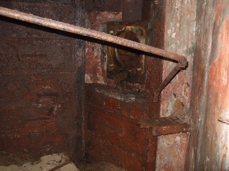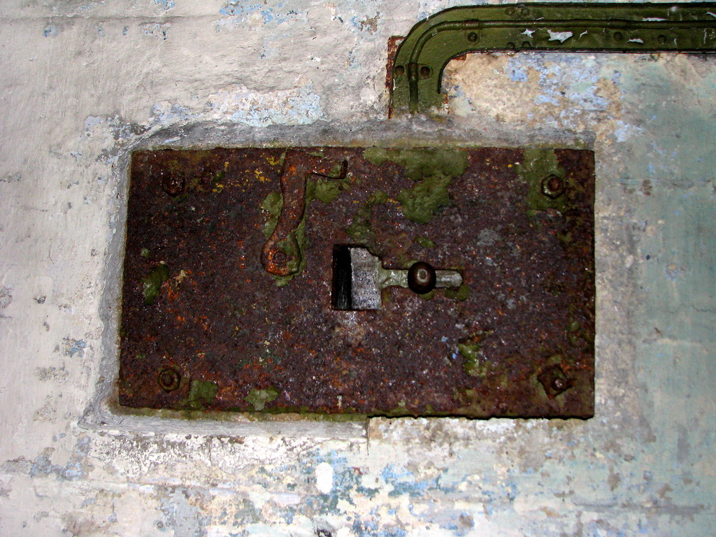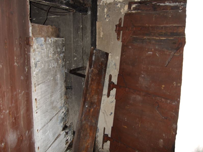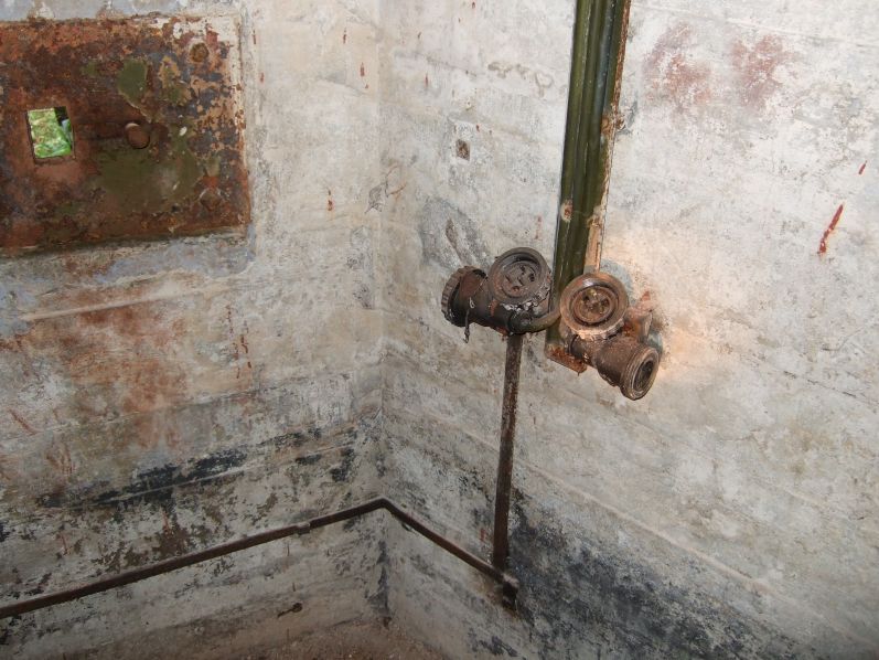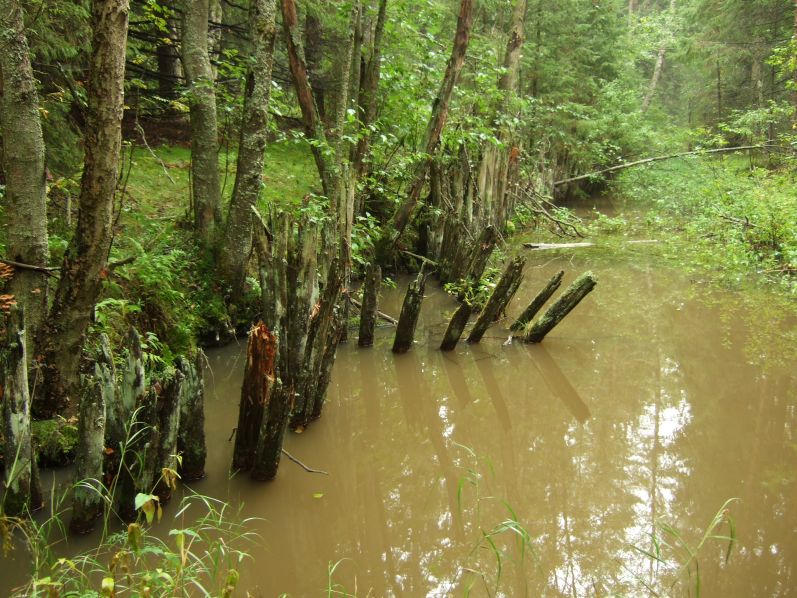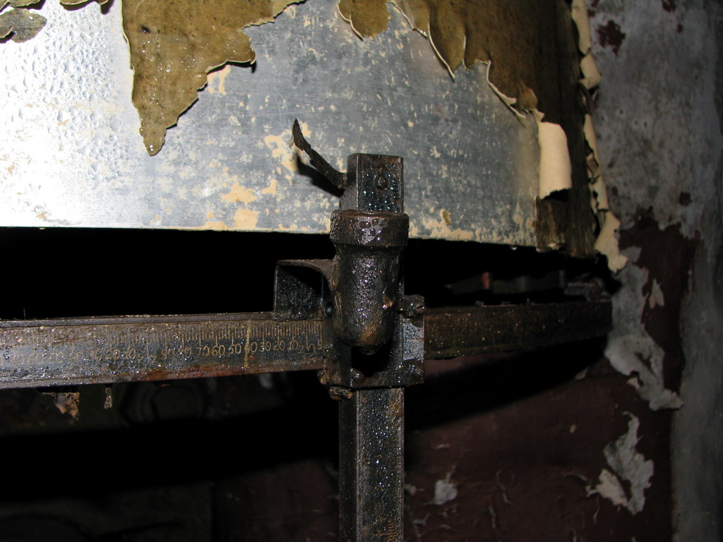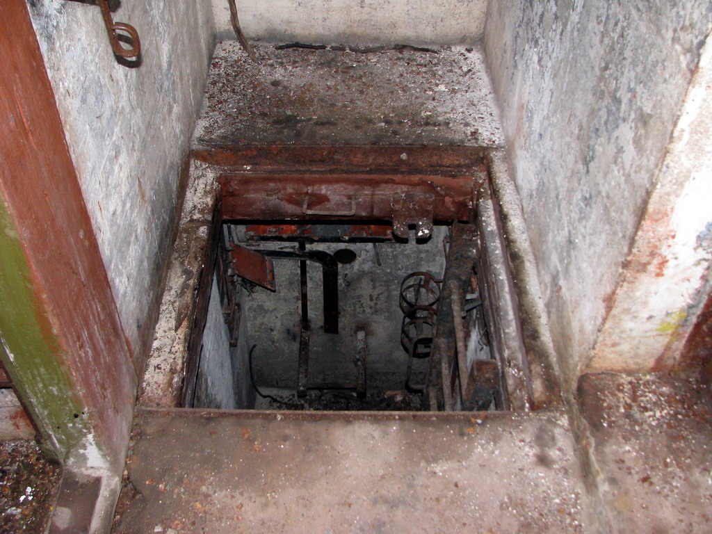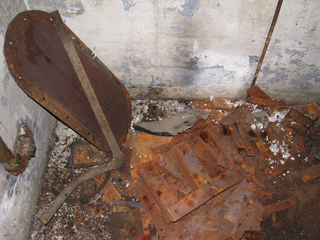 Первый дот был найден в конце некоей канавы. Ее длина метров 300. Стенки начала канавы в свое время были заделаны бревнами. Прямо как Новая Голландия во времена Петра 1. Подступы к доту перерыты окопами. Большего числа окопов нигде не видел. Ну, очень много. Дот четырехамбразурный пулеметный. Два этажа. Как и везде сильно зарос лесом. Особенность дота в том, что командирский перископ находится прямо при входе, а не в отдельном командирском помещении в глубине дота. Люк на нижний уровень и рядом перископ. На нижнем уровне когда-то стоял дизелек. Остатки блока цилиндров лежат на поверхности недалеко. На плите, где был дизель-генератор остался лом. Им пользовались при выламывании металлических частей. Дороги близко нет, и как все это перли на горбу, чтобы сдать в металлолом? На нижнем уровне из интересного можно отметить самодельную выгородку, где вешались шинелки (сделана выгородка из досок, с дверью) и остатки оружейной пирамиды на 10 единиц оружия.