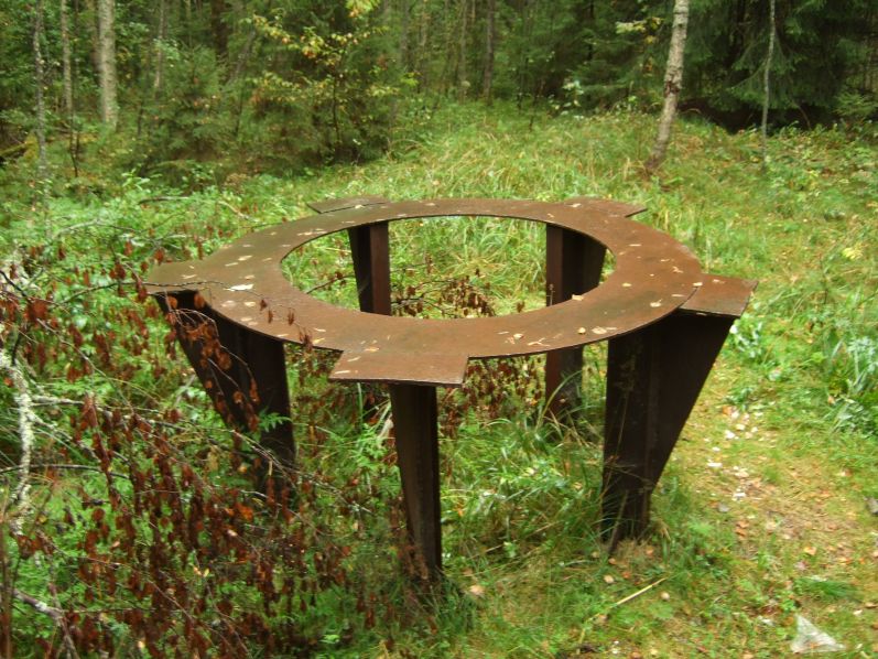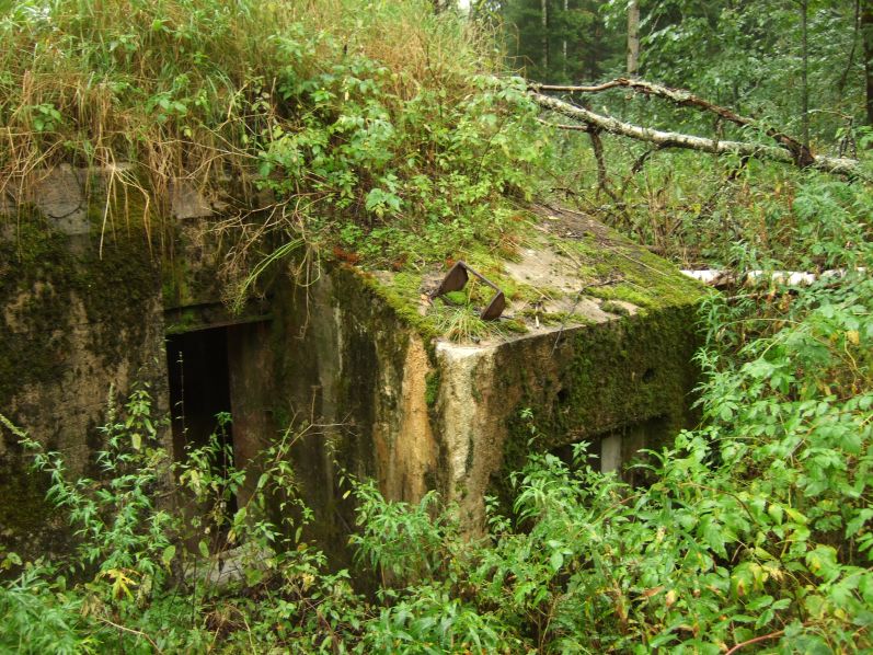 Следующий дот выдвинут ближе к передовой. Видимо, недооборудованный. Представляет из себя помещение в один боевой каземат. Находятся амбразуры: под арт орудие ( миллиметров на 45), две пулеметные и одна, вроде, как ружейная. Имеется труба под перископ. На покрытии есть прямоугольный вырез, вероятно, под наблюдательную башенку. Башенки уже, конечно, нет. Дот обложен булыжниками и обсыпан землей. Кое-где обсыпка и булыжники нарушены. Труба перископа пробита пулями. Недалеко есть непонятная металлическая конструкция. Используется местными грибниками в качестве обеденного стола. Вокруг россыпи яичной скорлупы.