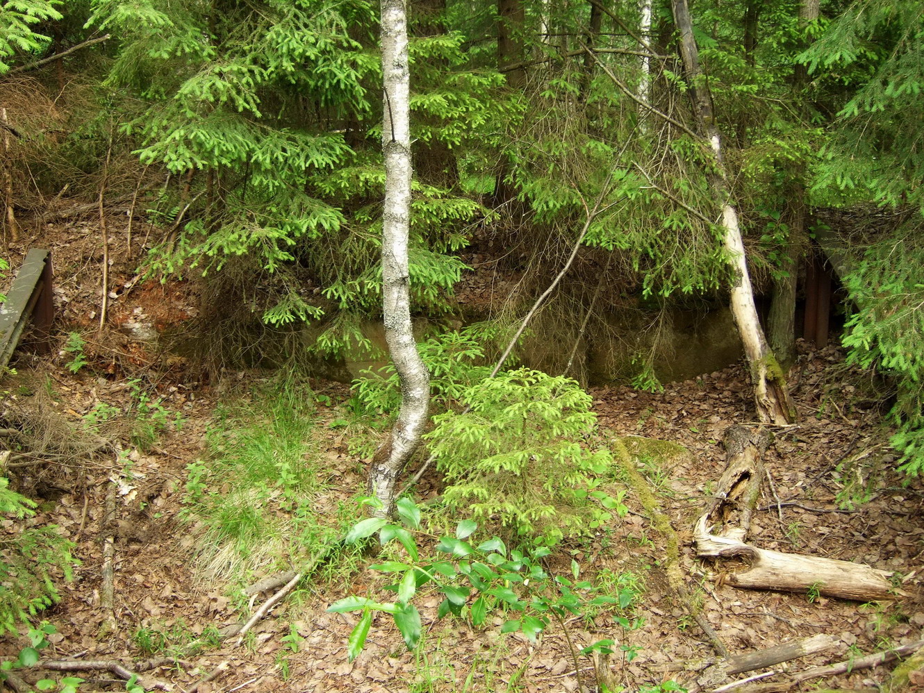 Давно хотел проверить, что же находится в лесу между в/ч в Черной речке и дорогой на Елизаветинку. По слухам, там могут бегать стаями Черепахи с Крокодилами. Увы и ах! Всех разогнали строители коттеджей. Весь лес раскорчеван, спилены зачем-то молодые деревца. Везде разбивка на квадраты. Отсыпаны дороги. Уже построены несколько десятков коттеджей. От дороги их почти не видно, расположены они где-то метрах в 80-100. Но кое-что, конечно есть. Множество окопов и землянок, буквально одна на другой. Проверил несколько своих точек. Некоторые уже под коттеджами, другие не представили интереса. В верхней части массива у садоводства имеется ряд остатков очень больших землянок. Прошел немного по садоводству и вышел к крайним ангарам в/ч. Забор с остатками колючей проволоки, много дыр - заходи не хочу. Ангары представляют из себя только стены и крыши. Везде остатки передвижных станций связи. Все это охраняет часовой на вышке. Стреляет, наверное, без предупреждения.