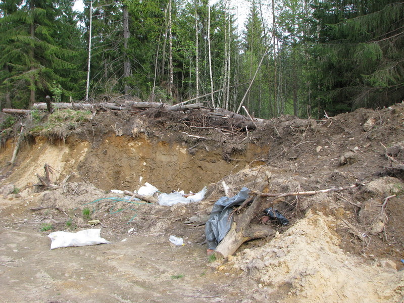 Сразу в лесу, за последней дорогой, там только-только нарезаны участки. Чтобы попасть туда, нужно преодолеть вот такие дерево-земляные преграды.