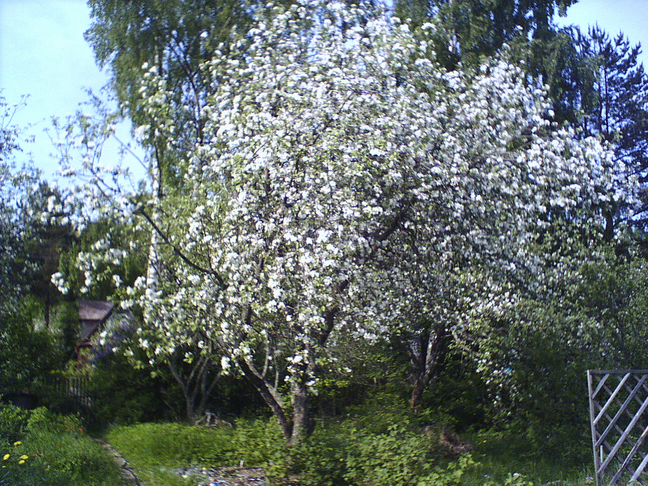 Та самая "яблоня в цвету". Увы - покойница. Под весом яблок она разломилась. Пришлось спилить