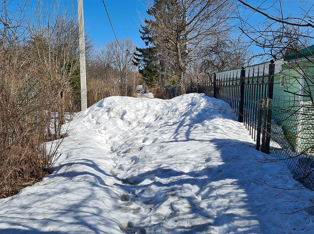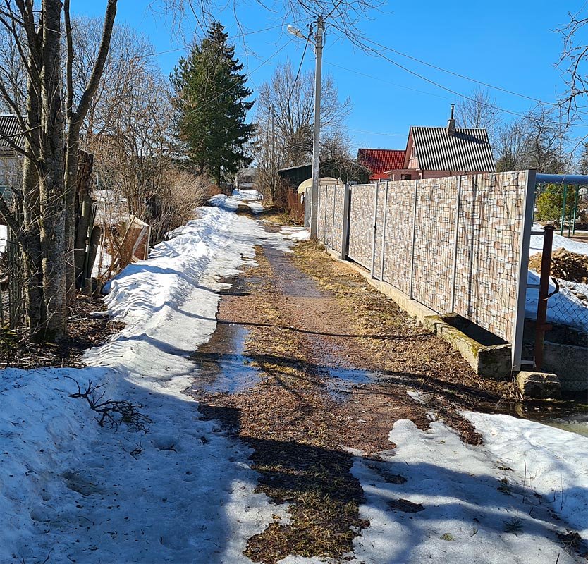 Сегодня вновь был с проверкой. Снег активно тает. Я вполне уверенно дошлепал от ж/д магазина до своего участка. Дороги в большинстве освободились от снега, мокрые и мягкие. Вот пример периферийно улочки (моя):
