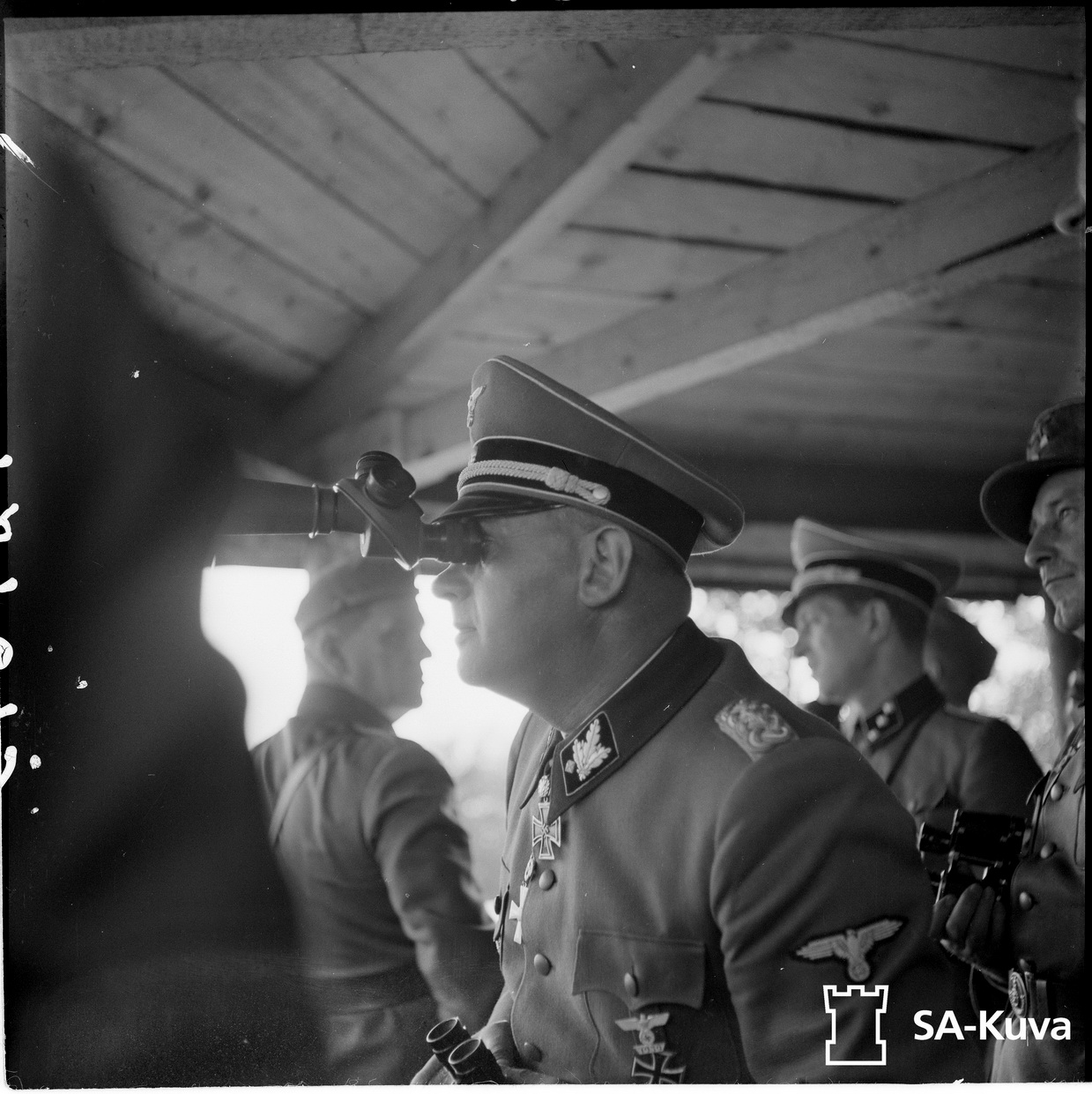 У финнов в Н.Алакюле была еще стационарная вышка для наблюдения. Хорошая с крышей и бутербродами. Есть ряд фотографий с разными персонажами. На фото от 4 июня 1943 года там отметился генерал-лейтенант СС Штайнер. Командовал в свое время дивизией СС Викинг. В составе его корпуса были части Нордланда. Поэтому финны и пригласили его в Алакюлю ( к вопросу о немцах на перешейке. Понятно, что он не с корпусом своим приехал, а в составе делегации не очень многочисленной. Поэтому, если кто найдет пуговицу от немецких штанов и будет очень удивлен, то ответ может быть очень простым - это пуговица от чьих-то штанов из немецкой делегации) в гости. Тем более, что как раз 1 июня он и получил звание генерал-лейтенанта. Инфа про Штайнера есть в инете