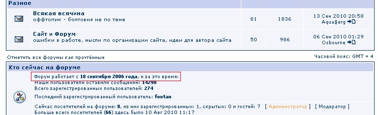Предлагаю дополнить запись в самой нижней части страницы о числе сообщений на форуме (ныне около 10300) и время, с которого идет отсчет, т.е. создания сайта.
