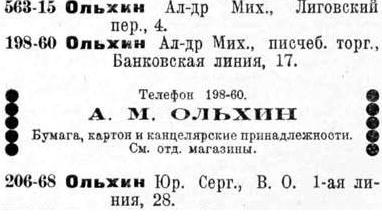 Просмотрел адресные книги города с 1892-го по 1940-й. Количество Ольхиных к 1917-му году неуклонно увеличивается. После революции их остается трое, а потом и вовсе один. Последний Ольхин, Владимир Сергеевич, упоминается в 1934 году.