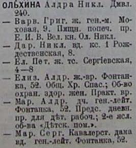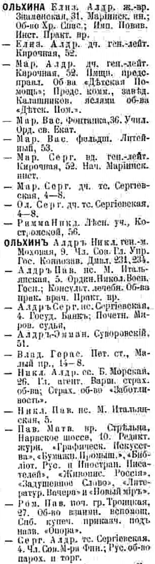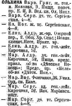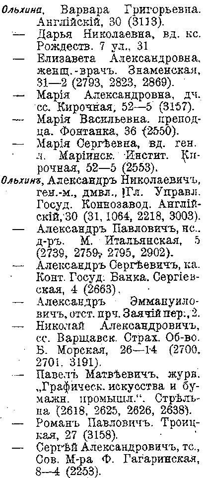 Вторая упоминаемая в справочниках ветвь является двоюродной по отношению к Александру Николаевичу. Александр, Сергей, Николай, Елизавета, Мария – тоже внуки Александра Васильевича. Все проживали в разных местах. Мария проживала с мамой-начальницей при Мариинском институте на Кирочной ул. 52. Ныне это дом 54. Она заведовала разными детскими организациями. Затем они переехали на Фонтанку 52. Николай работал в страховом обществе и жил на Б. Морской ул. 26 – это угол Гороховой ул. Сергей состоял в совете при министре финансов и жил на Сергиевской ул. 4. Ныне это ул. Чайковского, угол Гагаринской ул. Лишь опальный поэт Александр проживал в Белоострове. Постепенно родовым гнездом становится дом на Сергиевской ул. 4. К 1917 году там проживает большинство Ольхиных.