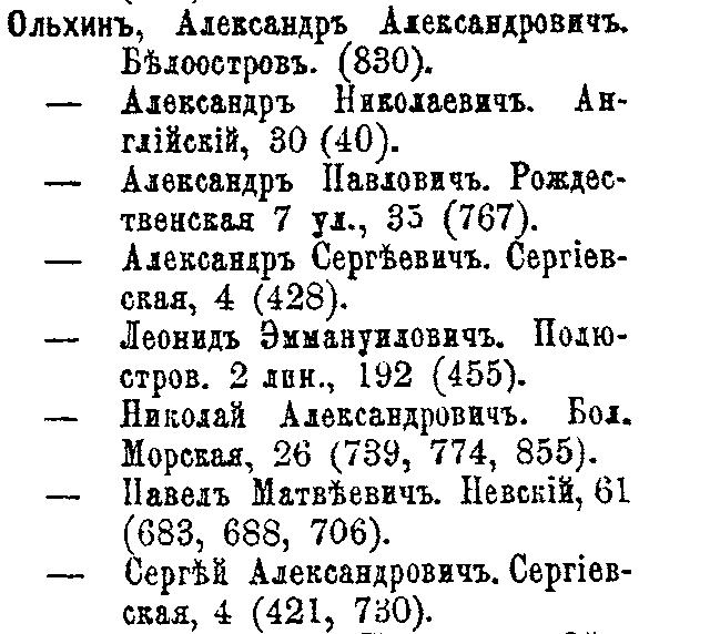Единственным домовладельцем в те времена был Александр Николаевич Ольхин, внук известного нам Александра Васильевича, генерал, член совета главного управления государственных конных заводов, шталмейстер. У него были дома на Английском пр. 30 и на Большой Морской ул. 33. Затем, видимо, дом на Английском был продан и появилось владение на Моховой ул. 9. В обоих этих домах он последовательно проживал, а дом на Морской ул. сдавался. С ним проживала и жена его, Варвара Григорьевна Соколова-Бородкина. Дом на Английском пр. с тех пор был перестроен, другие два сохранились в прежнем виде. Оба дома отобрала у наследников советская власть.