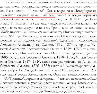 В разные годы по-разному, да и Ольхиных с годами прибавилось. Но, если ответить конкретно на заданный вопрос, то недвижимость в СПб меня интересует в меньшей степени, т.к. занимаюсь краеведением Белоострова. А вообще Кайдановы-Ольхины были очень предприимчивые люди и создали богатство своими руками и своей головой.Osbourne писал(а):А по сути, из Ваших источников что получается? Дом на Моховой, участок на Выборгской стороне и дом на Большой Морской? Или было что-то ещё?