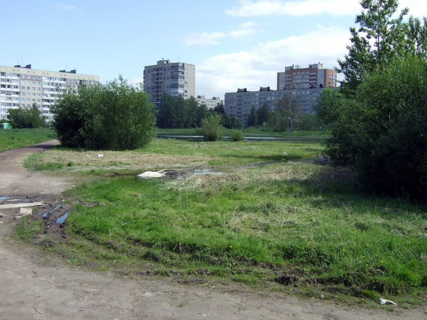 Вот там, рядом с прудом. Крестов и надгробий, естественно, нет. В нашем городе полным полно скверов и садиков, которые когда-то были деревенскими кладбищами. Хотели тут недавно застроить одно такое около метро "Ломоновская". Оказывается, что все-таки нельзя. Главно, напомнить об этом некоторым "забывчивым". Я думаю, на эту площадку около дота уже многие застройщики губу раскатали. Для них историки и краеведы - заклятые враги.