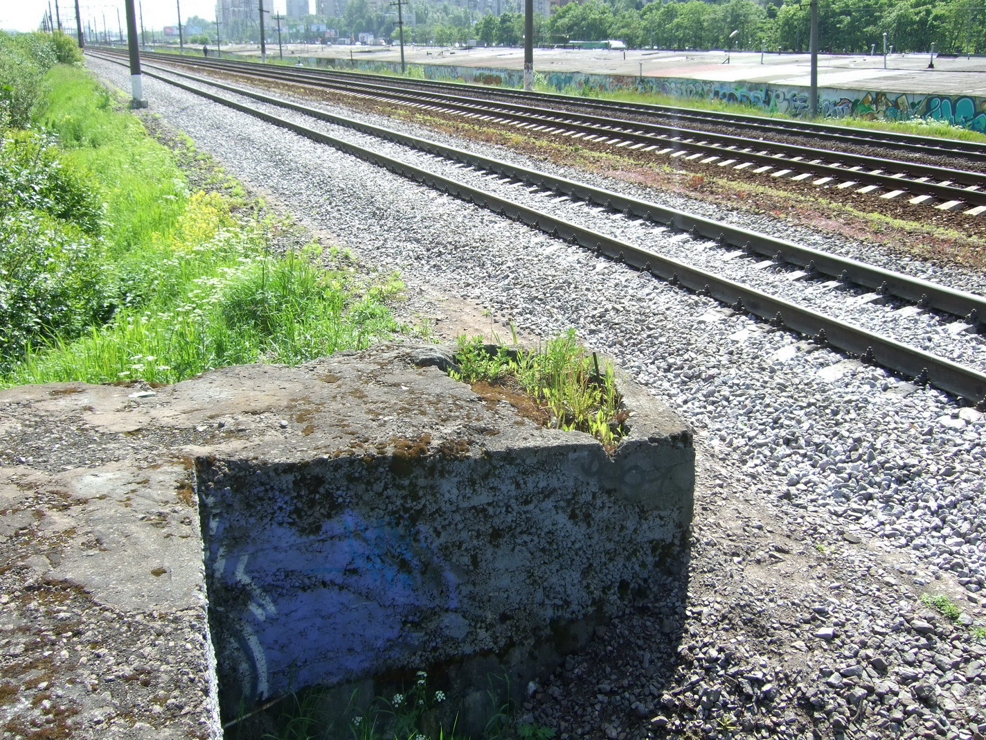 Сегодня обследовал два дота, которые находятся южнее моста над проспектом Славы недалеко от жд платформы. Ближний к мосту дот - пулеметный. Амбразура засыпана черным крупным песком. Этим песком также подсыпана жд насыпь почти везде. Дот интересен тем, что его "распилили" пополам по диагонали при строительстве третьего жд полотна. До ближнего рельса не более одного метра. Место распила аккуратно заделано бетоном. Амбразура (по гуглу) имеет направление стрельбы порядка 135 градусов. Что-то там ничего интересного нет. Скорее всего дот построен для стрельбы в лоб наступающим с колпинского направления немцам. Ну, и находится он прямо на бывшем Южном шоссе