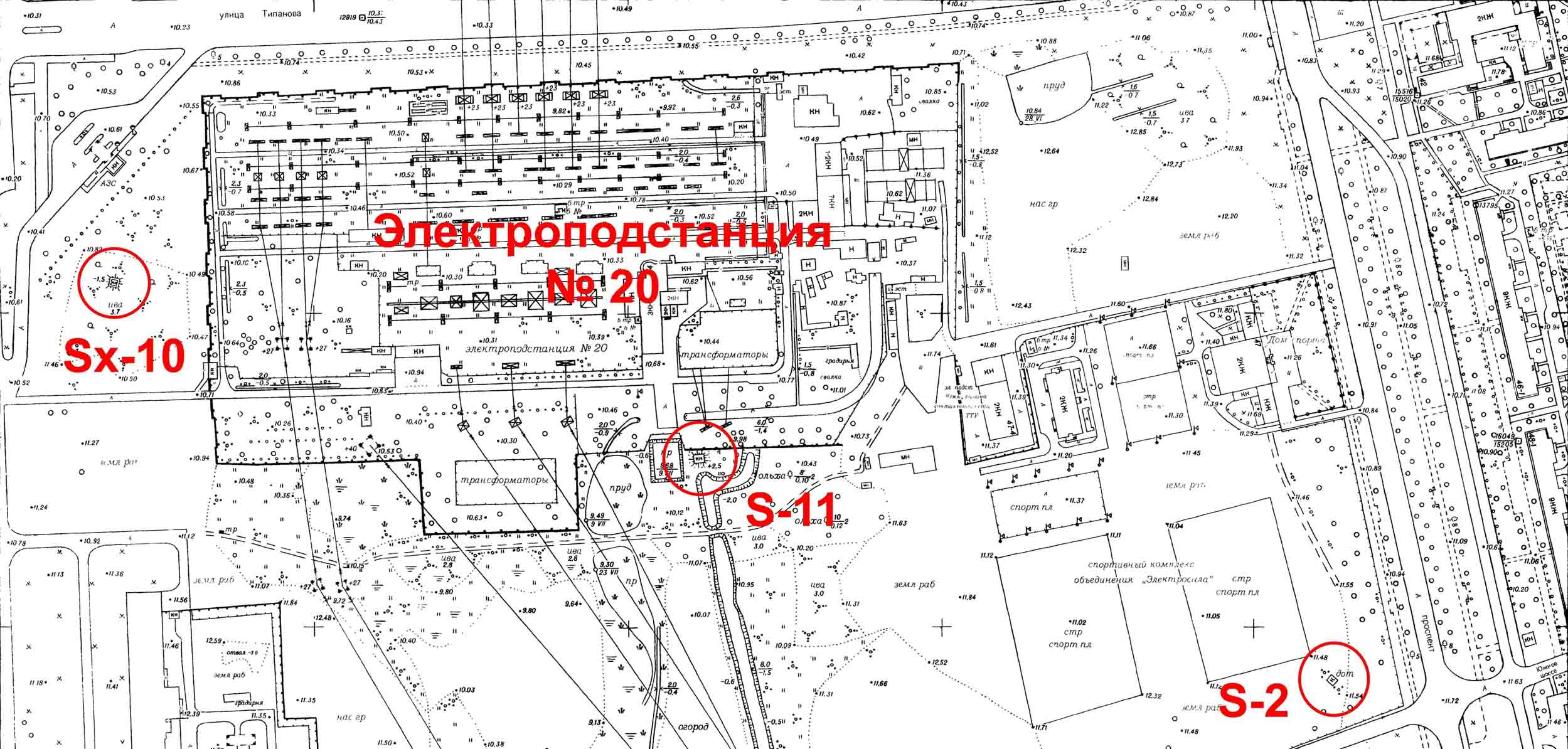 Фрагмент топогеодезического плана Петербурга с обозначением местонахождения ДОТов S-2, S-11 и S-10 (последний — предположительно). Участок ул. Типанова между проспектами Ю. Гагарина и Космонавтов.