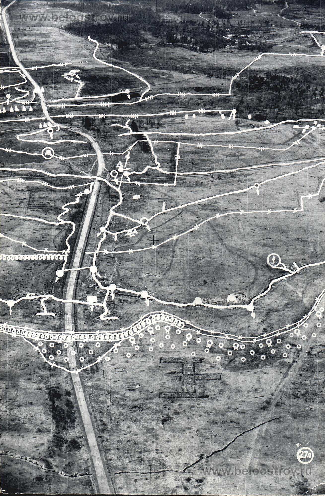 Несколько мыслей по поводу. Судя по размерам и расстоянию между телеграфными столбами, общая длинна и ширина этой загадочной фигуры - порядка 60-80 м, а ширина "полос" - раз в 6 меньше, т. е. порядка 10-15 м. По краям, то ли окопано канавами, то ли обнесено кустарником. Линии очень неровные - это точно не каменная кладка, т. е. на фундамент не похоже, кроме того что-то он великоват для деревянного здания, а от каменного остались бы кучи камней. Да и теней нет. А судя по теням от телеграфных столбов (солнце на юго-западе), время съемки - порядка 14-17 часов. Да, еще о времени, за фундаментом кирхи хорошо видны большие деревья. Хвойные стоят густо покрытые хвоей, непострелянные, непокалеченные, а рядом лиственные без листвы, т. е. это поздняя осень или весна, но никак не лето, и тем более, не зима, как вы понимаете.