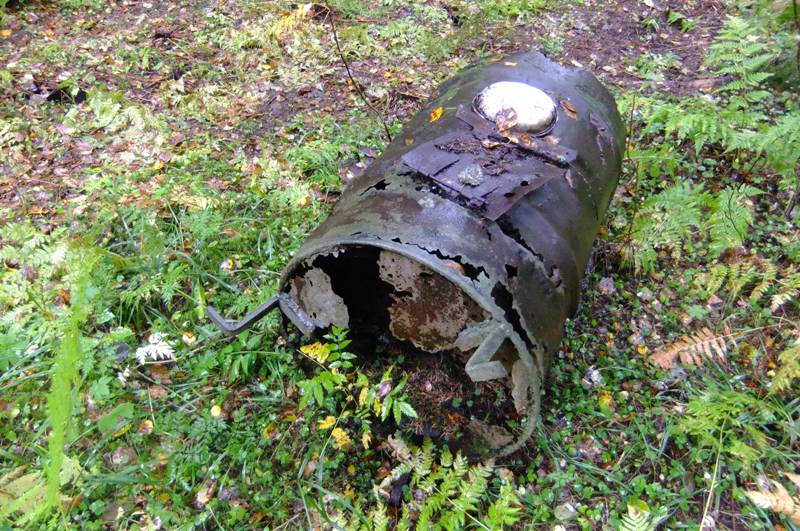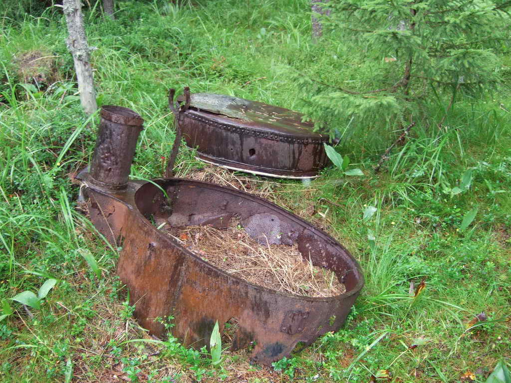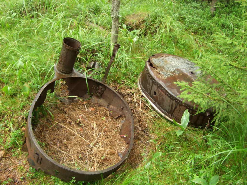 . Естественно, давно разбазаренная. И, в отличие от дотов КаУРа, не в целях пополнения баланса Вторчермета и собственного кармана за счёт железа. Оно-то как раз и сохранилось. Всё металлическое, что составляло повседневный суровый тыловой быт оккупантов, в большом кол-ве, в той или иной степени покорёженности валяется по сторонам и заросло. Особенно интересно было увидеть белофинскую "буржуйку",