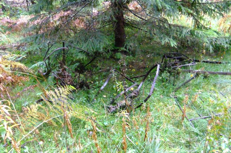 . Нашлись также замечательные запряжные сани, точнее практически целый, только несколько помятый, железный каркас явно кустарно-кузнечного изготовления. Доски настила и оглобли, понятное дело, давно сгнили или пошли на дрова. А вот "штучные" кованные гвозди, которыми это всё приколачивалось, целы - хоть сейчас забивай. Остальное многочисленное железо уже не поддаётся идентификации. Так что коллекцию артефактов - реальную и виртуальную - удалось слегка пополнить