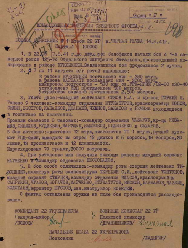 Самый интересный в этой серии документ. Захватили 1 финна и 1 винтовку, но при отходе потеряли командира, двух красноармейцев и пленного финна. Винтовку, похоже, доставили.