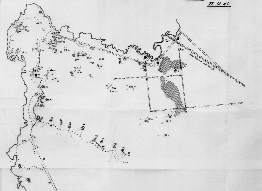 Карта нашей обороны в районе Майнила - Алакюль в 1941 году. На ней только пять артиллерийских дотов