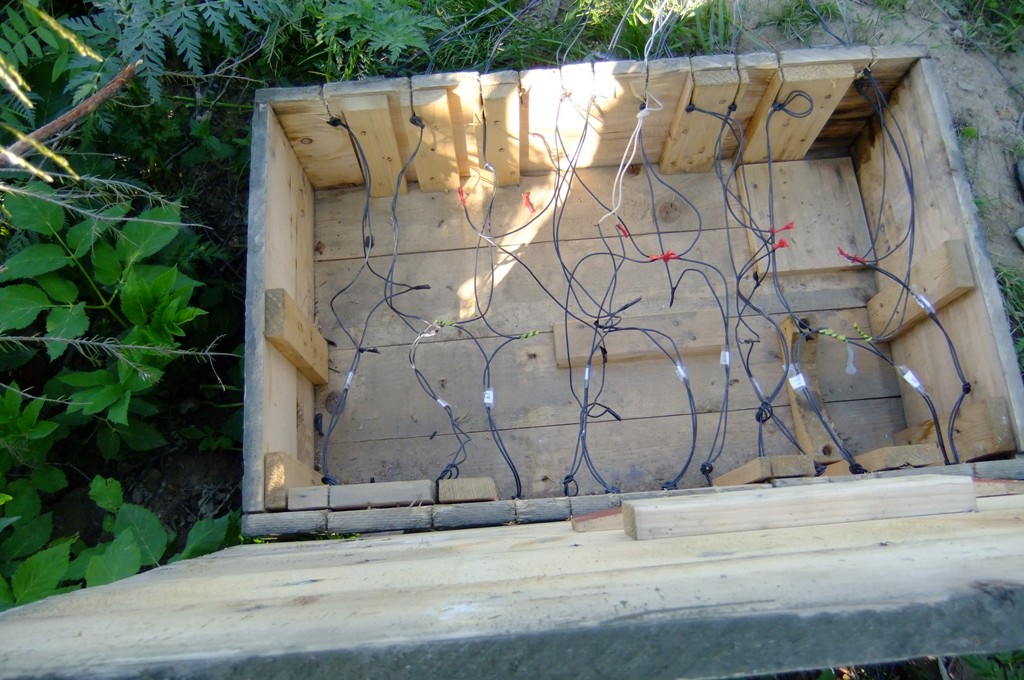 Вся прилегающая территория усеяна осколками. Можно себе представить, что ждёт посетителя этих мест во время взрывов. На территории, окружённой колючкой, ветки деревьев кастрированы разлетающимся железом. Есть два перпендикулярных друг другу железобетонных укрытия - одно со входом на западе, другое со входом на юге. Построены из типовых ж/б "рамок", как и укрытия у Харвази. Взрывают на двух пустырях по обеим сторонам бункеров. Северная поляна используется с давних пор - воронки видно в Гугле. Южная - свежая. Даже несмотря на удалённость и малую посещаемость этих мест странно, что территория никак не охраняется. Типа, "кто пришёл - мы не виноваты". Как и в случае с карьером в Калелово, не покидает ощущение, что тут тоже "дух выбивают" из бывшего поселения - всё происходит ровно там, где раньше была деревня Термолово..
