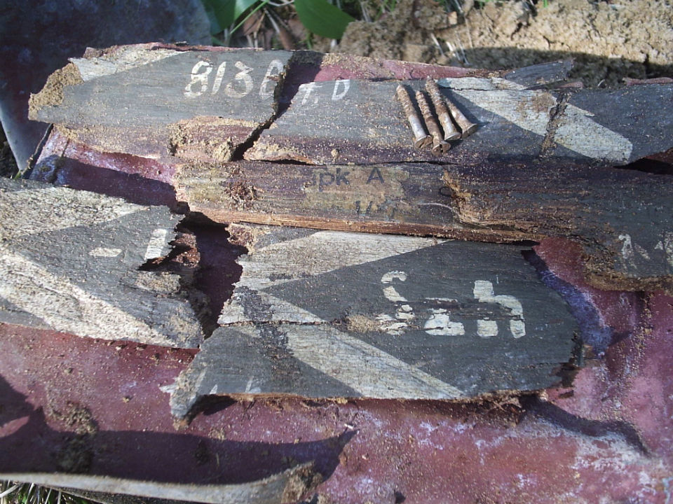 При извлечении из земли пустого цинкового ящика попались полуистлевшие досочки с остатками надписей.А в досочках похоже шурупы из нержавейки.Больно они блестели.Как я понял цинковый ящик находился внутри деревянного.