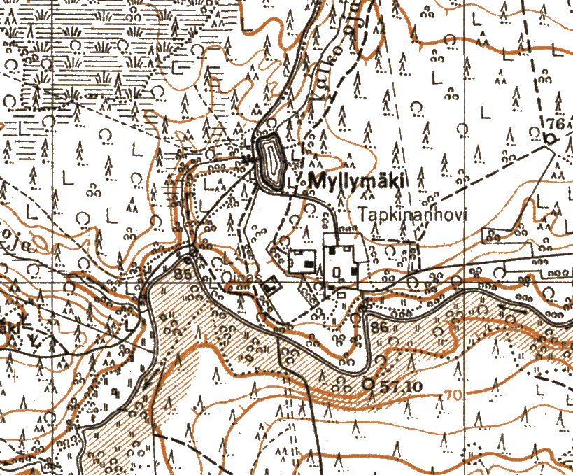 На расстоянии 1- 1,2 км на северо-запад от высоты 116 Suri-Kaljala через реку у впадения в реку ручья Valko-oja (ГШ - руч. Беленький) выше по его течению отмечен явно искусственный водоем и хутор Myllymåki (Мельничная гора). Интересно осталось ли что-нить... место глухое....
