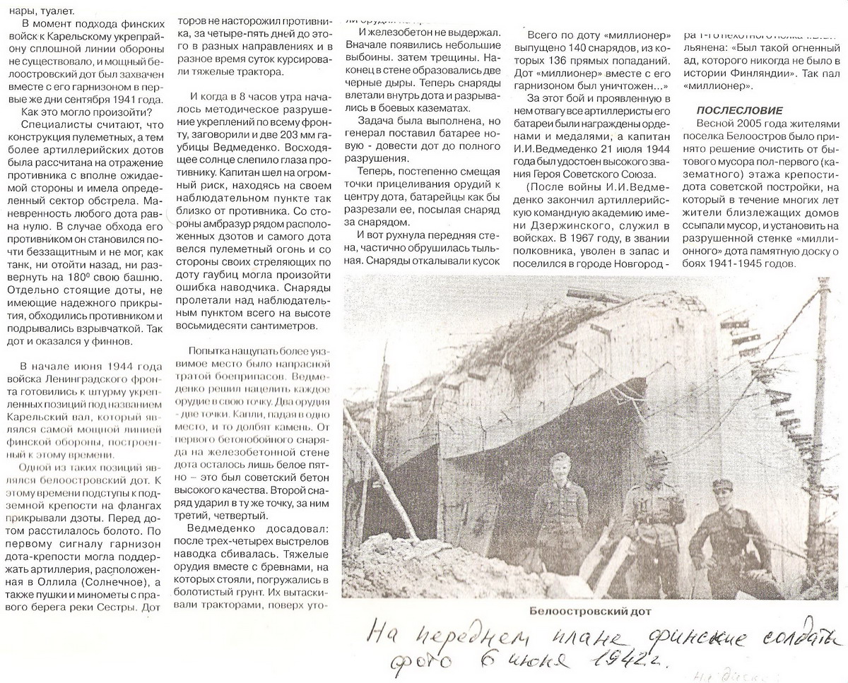 «Несмотря на то, что противник беспрерывно обстреливал наши подразделения, он продолжал мужественно и храбро оставаться на своем боевом посту и управлять огнем. Финны называли такие ДОТы «миллионный» потому, что стоимость их приближалась к одному миллиону финских марок.