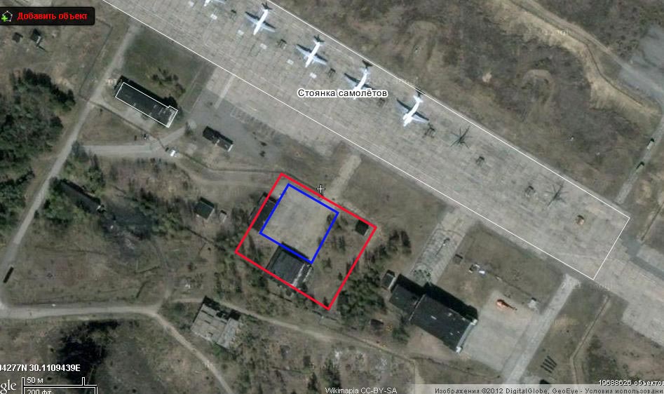 P.S. Дорога между 1-м и 2-м самолетами, в конце дороги белый квадрат - бетонка, площадка для временного пребывания самолетов, за ней - черный квадрат, это ангар с черной крышей.