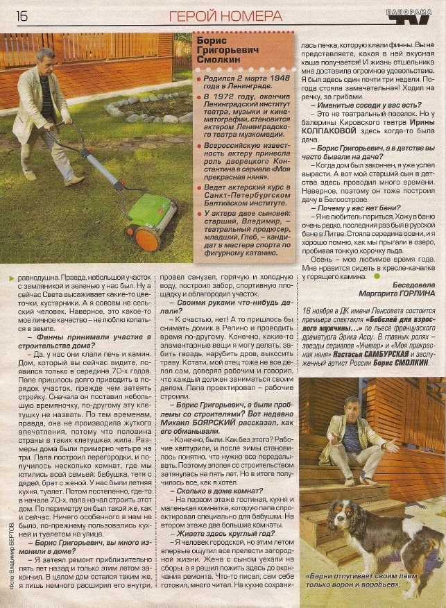 В журнале "Панорама-ТВ" № 45 (с программой ТВ на 11-17.11.2013) героем этого номера стал артист Борис Смолкин. В материале "Я должен беречь родовое гнездо" речь шла о дачном участке в Белоострове, дом на котором построил его отец - архитектор Григорий Смолкин.Полюстрово писал(а):Может, есть возможность составить нечто вроде "Книги уважаемых людей Белоострова", куда включить людей, проживавших в посёлке и чем-либо знаменитых?