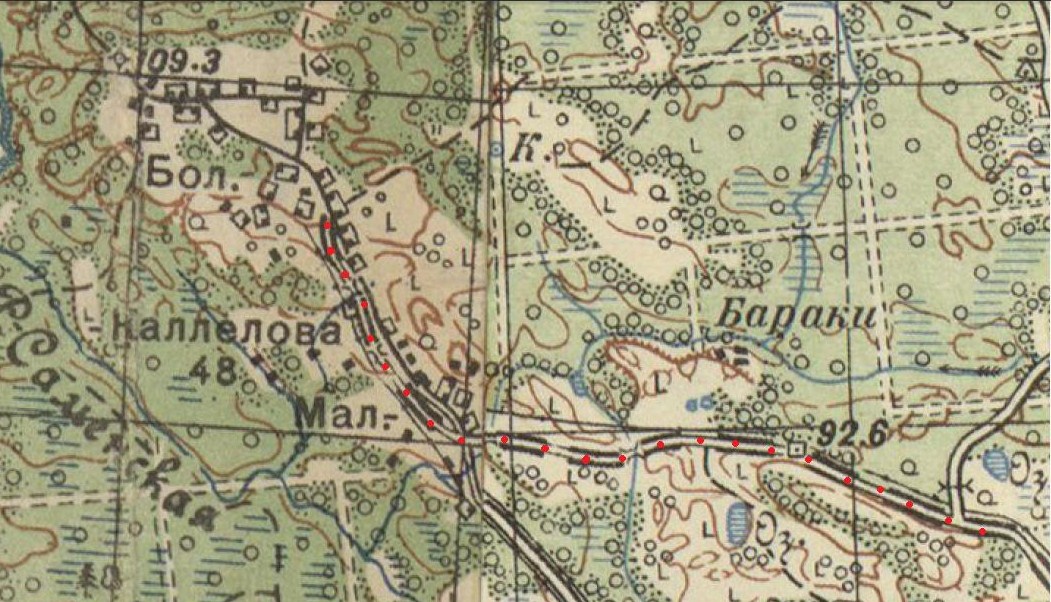 Посмотрим ещё раз на карты и на снимок. Это,конечно, не "первая танковая" , а часть новой дорога, проложенной перед войной как единое целое от Каллелово к Меднозаводскому БРО. Наверно, поэтому и финны назвали её Меднозаводской.